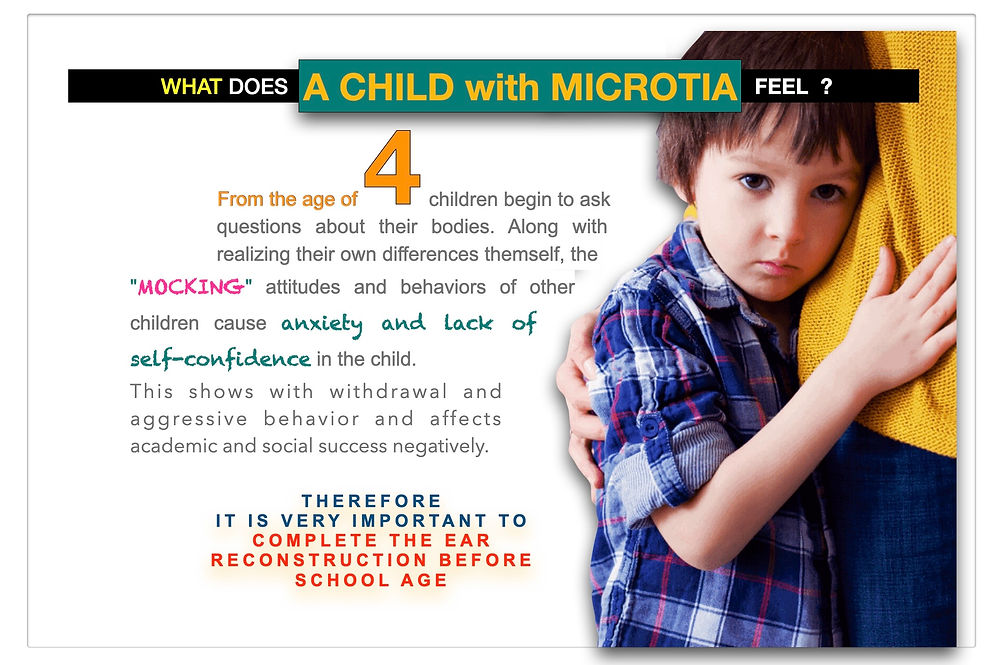 In children born with bilateral microtia, problems arising from hearing loss are at the forefront rather than shape differences. It is very important not to show tiredness or boredom when it is necessary to repeat what has been said to the child with significant hearing difficulties or when answering questions about the events around him. Otherwise, the child begins to suffer loneliness in the society and the picture becomes even more negative.
