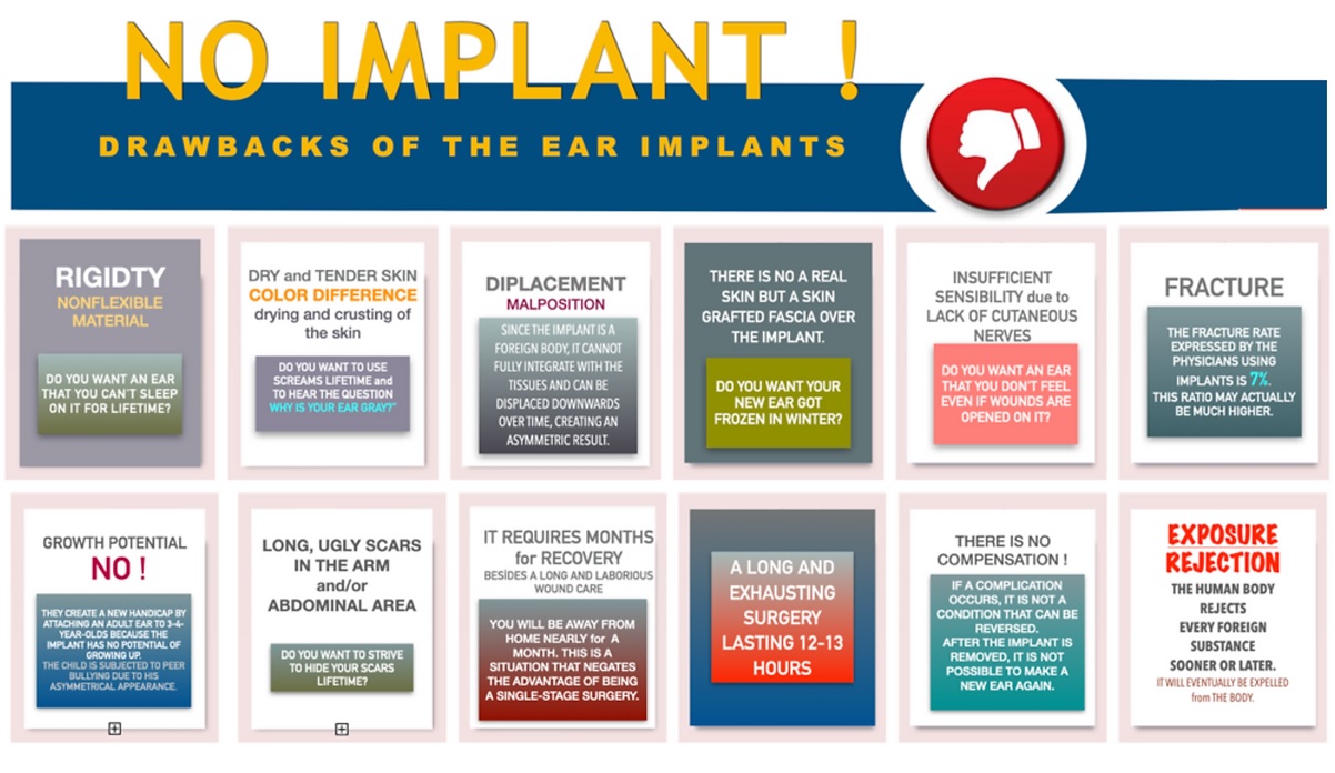 Although ear implants were developed to create an easy alternative to ear construction with humans own tissues, scientific clinical studies have revealed that they have serious side effects. In order to objectively evaluate the options for ear reconstruction, it is necessary to know these side effects in detail. As a doctor who has seen hundreds of patients who have permanently lost the chance of a new ear reconstruction due to complications of ear implants.I believe that implant applications should be avoided in ear reconstruction. Please read carefully the information given below about the side effects of ear implants.