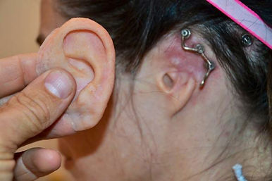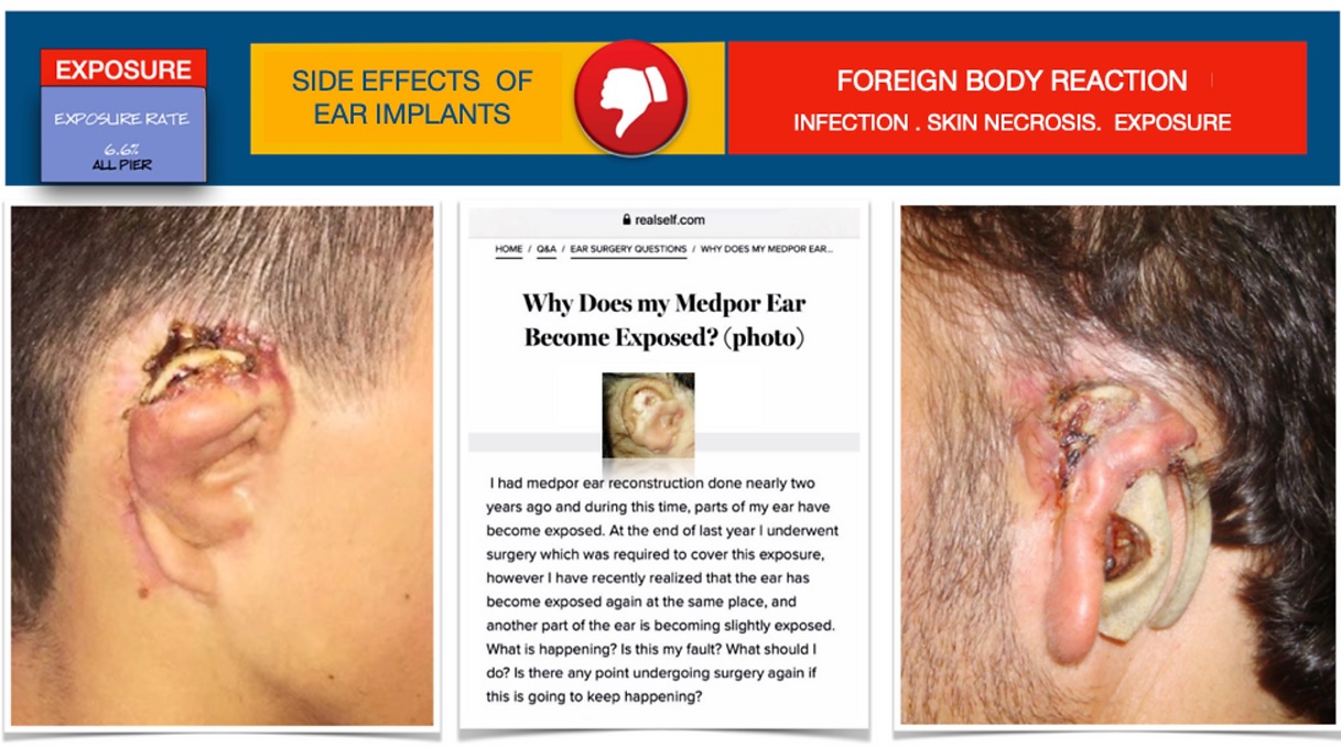 Every material placed in the body, except for a persons own tissues, sooner or later creates a foreign body reaction, and this reaction continues with repeated infections until it is eliminated from the body. Implants placed in a protruding organ such as an ear, especially under a thin tissue cover, will inevitably be expelled from the body due to a foreign body reaction, recurrent inflammations and skin decay in the long term.